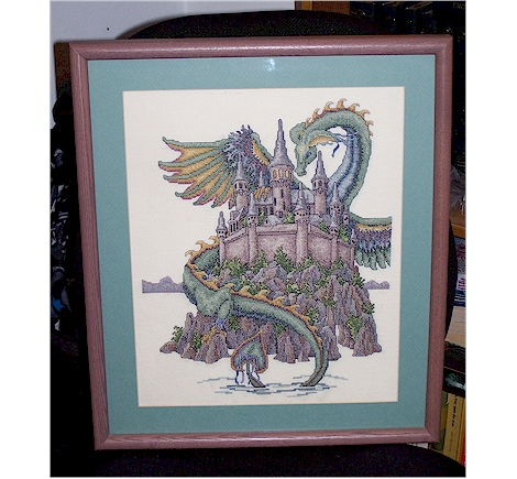 My second piece I stitched back in 1988 is another one that I did for Hubby. He loves dragons, fairies and wizards. The whole fantasy world. Since I had an easy stitch with the California Raisins, I wanted a challenge. So I went totally hardcore with Teresa Wentzler’s Castle. Here is the finished piece:
