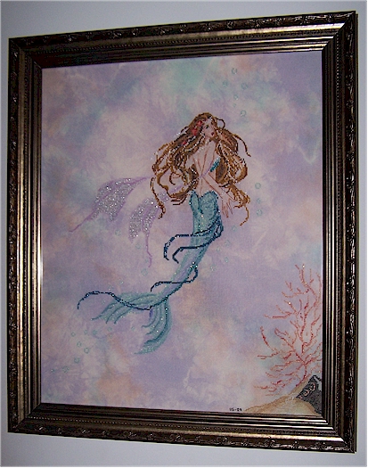 She is Passione Ricamo’s Galatea mermaid. I stitched this piece in 2009 on 28 ct Griffon from Sugar Maple fabrics. I believe that Sugar Maple is no longer in business and I remember it taking about 3 1/2 months to get my fabric. I recently told someone I thought it might be Silkweaver, but I just found my info on this piece and it was Sugar Maple fabrics that I had so much trouble with. So I have been a little leery about ordering hand dyes ever since. But I see so many beautiful fabrics on-line and I’m really itching to get some. I love the colors on this fabric and I am pleased with how Galatea turned out.