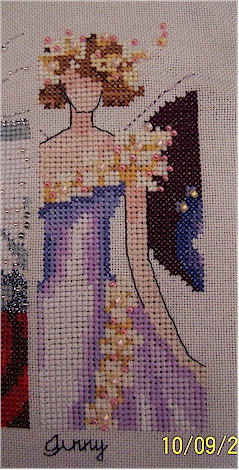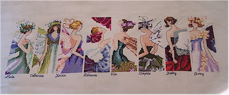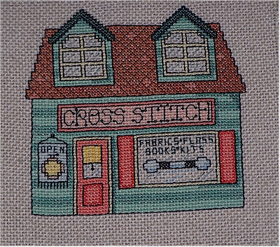 This one was also stitched from a series of magazine patterns, but I’m sorry to say that I can’t remember which magazine. I’m afraid I don’t know the name of the afghan fabric either, but I can tell you that it was stitched entirely with DMC Flower Threads. I’m not sure why those threads were discontinued as I enjoyed working with them. I still have a bunch, if not all of the colors left over. Here is a close up of the cross stitch shop: