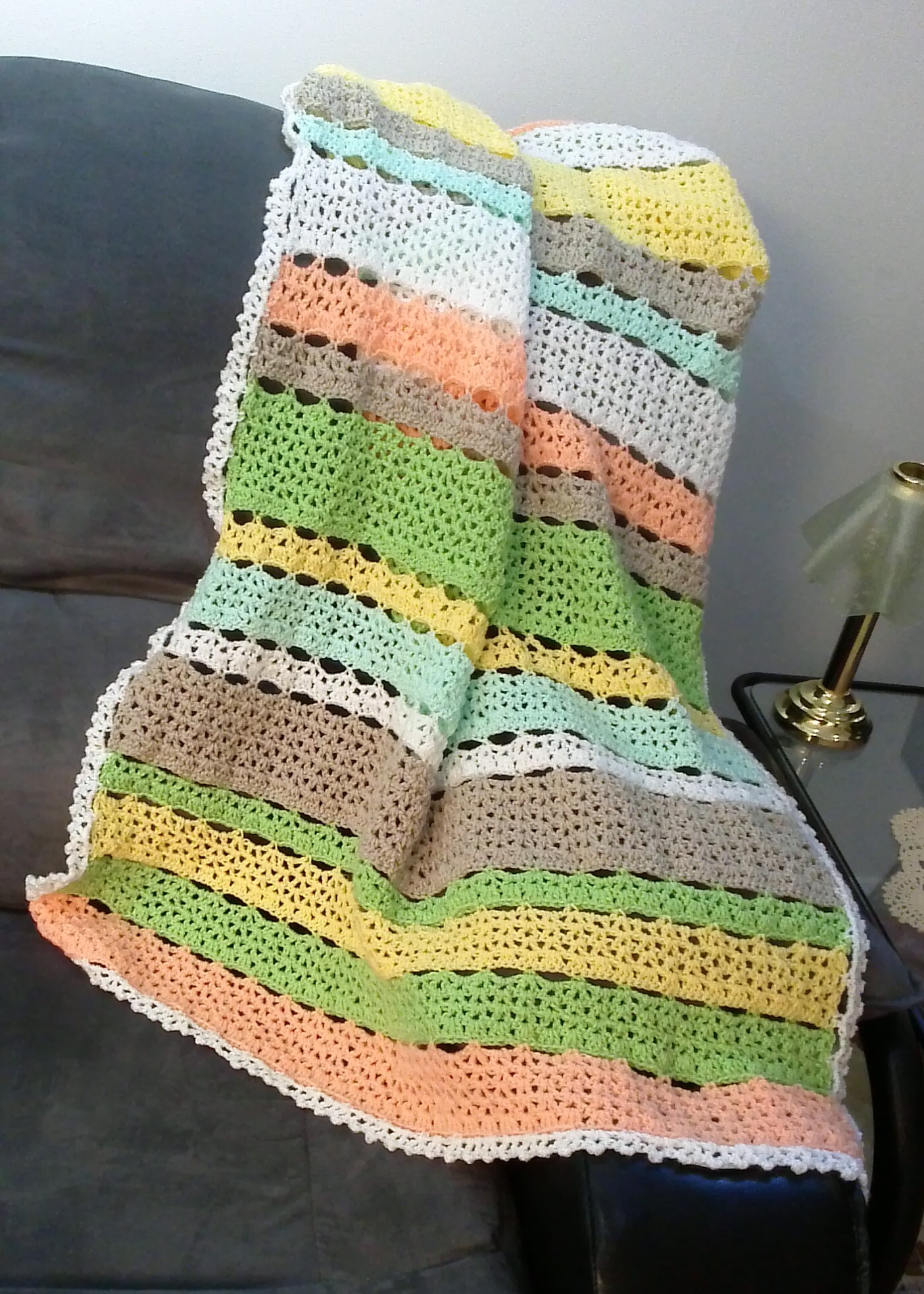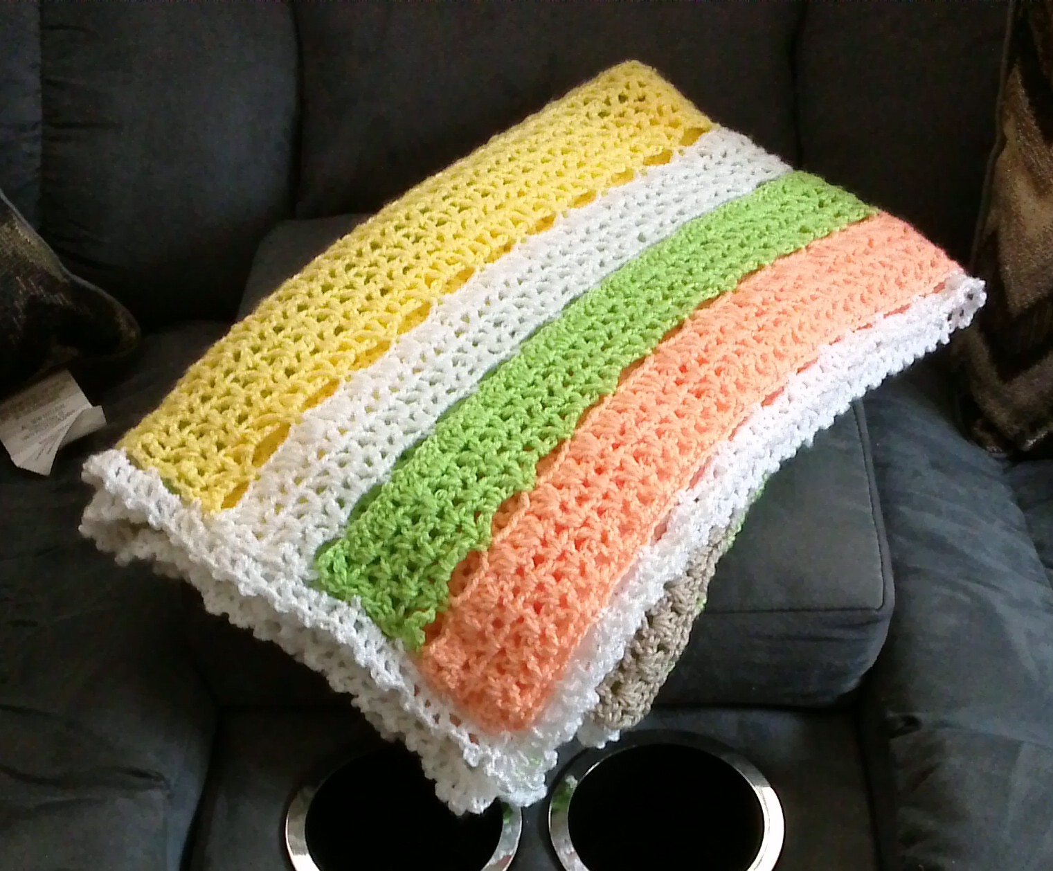 I only have 5 more rows to go on this Citrus Stripe Blanket. I will finish it, but I am not pleased with it. It seems that I still have an issue with turning and starting in the correct stitch. The first row of each color is a stitch that leaves big holes. I am still not sure I like them. I keep having visions of a baby getting their little toes stuck in them. Anyway, when I started, there were 25 of those holes across. After the first yellow stripe, somehow I did something wrong and only have 24 holes. Where I have stopped, I only have 22 or 23. So clearly, my crochet skills are not getting any better. And if I were to do another one of these (not saying I will, but I have lots of yarn left) I would not use the Taupe yarn again. The pattern called for Bernat Baby sport 300 grams and I barely used any! And the yarn is quite scratchy compared to all the other Knit Picks yarns that I used. They are so soft. I would definitely get another color in that yarn to replace the Taupe. I also have the border to do. We shall see how that goes.