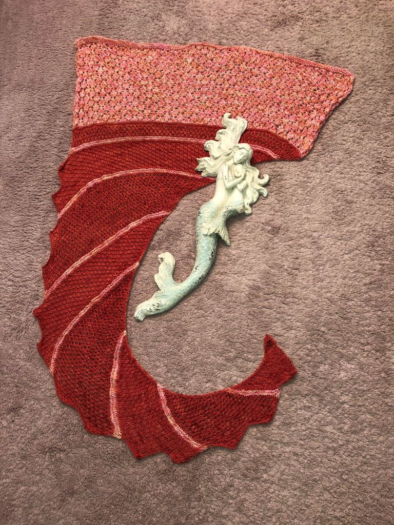 I have done quite a bit of knitting. So much so, that my tennis elbow has flared up. So I have been wearing my brace and trying not to knit so much at one time. On July 28, I joined the Mermaids in the Waves shawl. It has mermaid in the title; I just had to 🙂