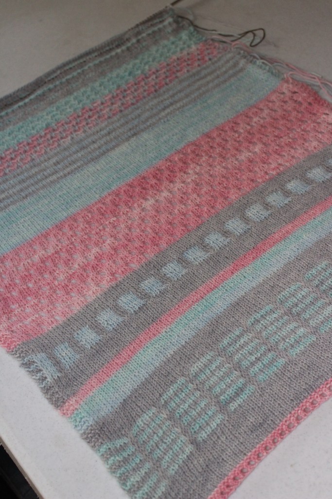 The yarn is Caroline, and I have mixed feelings about it so far. It has knitted up nicely, but so far 3 of the 4 balls have been a mess, coming out in hunks from the center. I have wound many, many cakes of yarn and this is the first time I have had this happen. That is why I am leaning towards it being the yarns fault 😉 This yarn creates some little fuzz balls that attach and tangle the yarn! How in the heck does that happen? And I have found some places where the double strand is broken 😦 So, I will see how this ends up. For now I will keep knitting.
