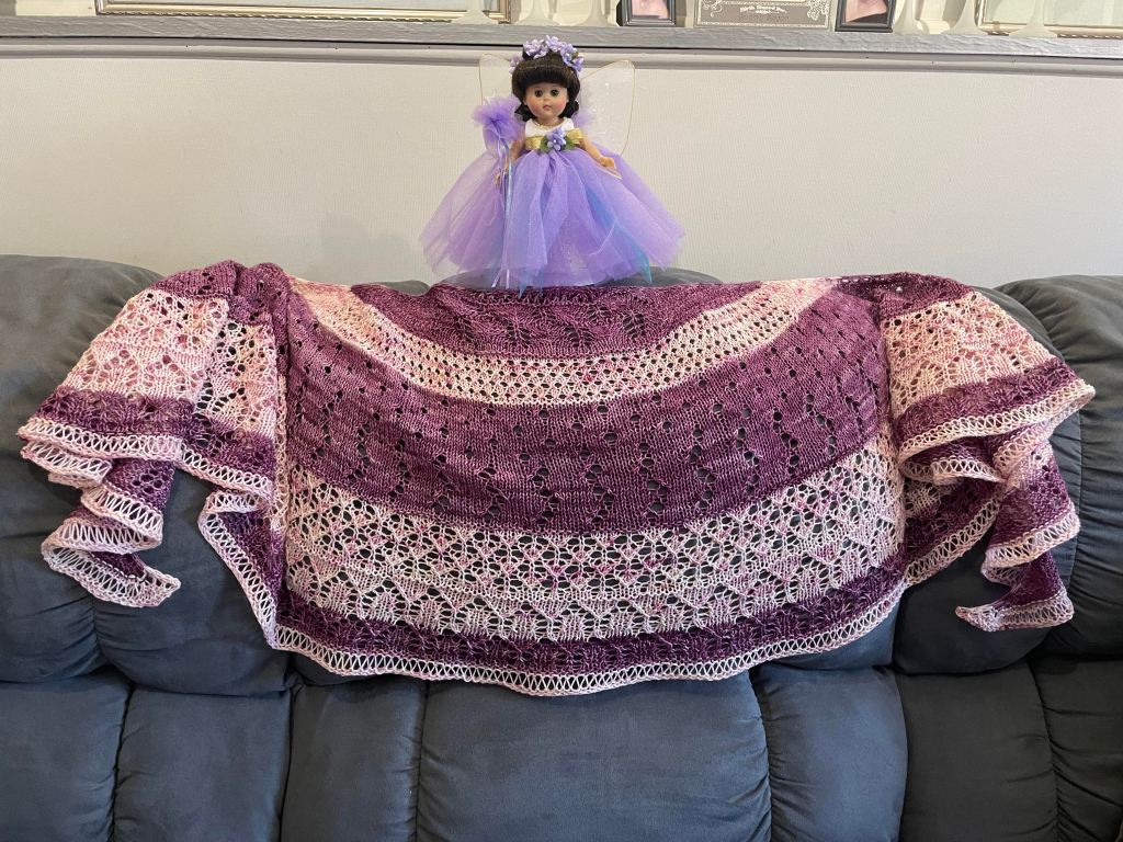 So, I am still keeping busy by crafting. I am also trying to get myself into some kind of routine since hubby will probably being going back to working in the office soon. And that includes making sure that blogging is in my routine again. So where did I last leave off…Oh, I finished the Fairies in the Snow shawl that I was working on.