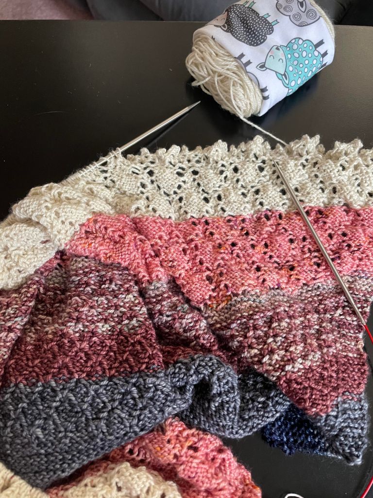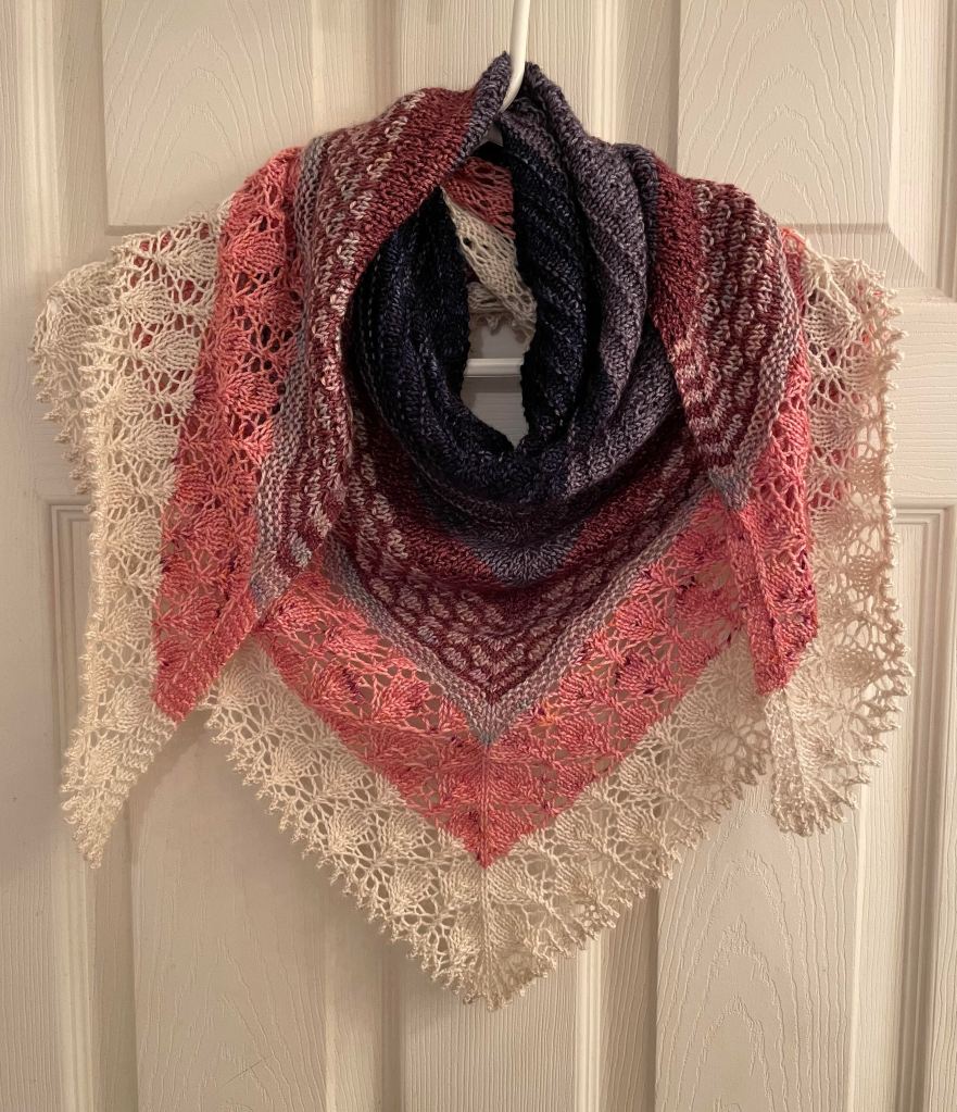 This week I got around to blocking it. Just look at how that lace opened up!! Knitting the lace was my favorite part of this pattern. I left out one of the repeats in the burgundy/gray section. So I added a few rows of garter stitch and that also brought my stitch count up to where it needed to be for the lace section. Yep, I added my own element! This pattern also suggested to add 2 rows of the next color, then 2 rows of the current color then continue with the next color. This meant lines of color in each pattern section. I knew from the beginning I did not want those lines of color, so I just switched colors when I was ready to. This really is a forgiving pattern.
