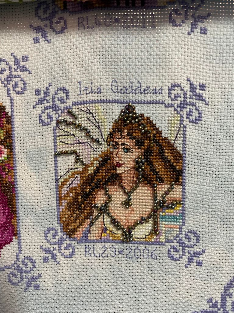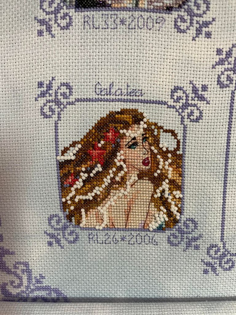 I finished the tail on Pearl of the Orient Seas, minus the beads. I have moved scrolls to the middle of the design to work upwards.