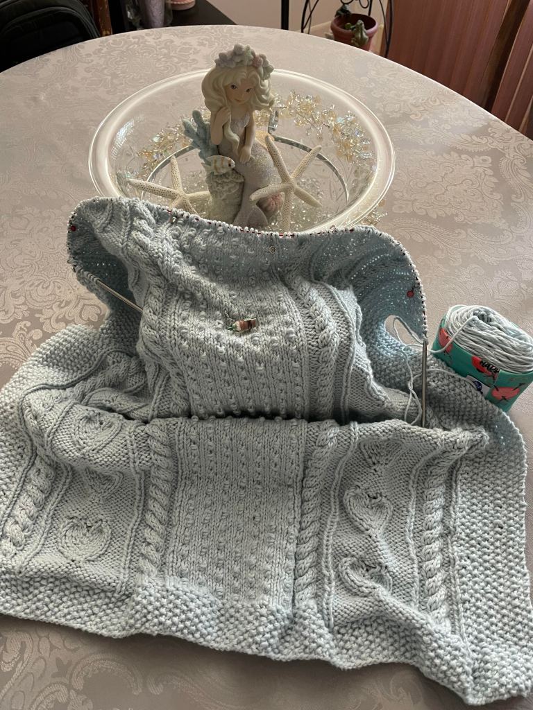 I decided on the Aran Baby Blanket because I love making this pattern. The designer is Sassafrass2 on Etsy. The yarn I used is Sweater Worsted by Blue Sky fibers.