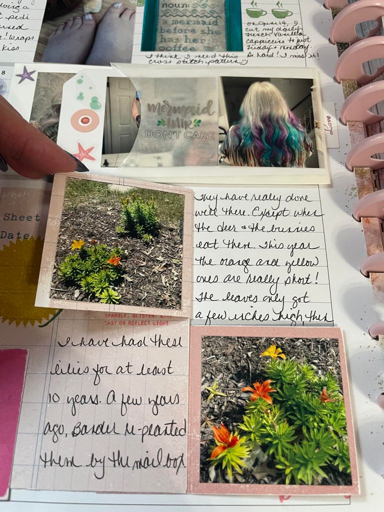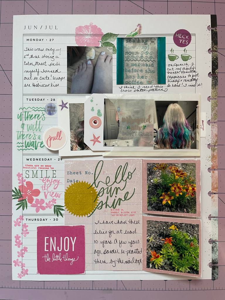 Hello my blogging friends. Can you believe it is August already? I have been so busy and going in many different directions. I have a new hobby; Memory Planning. It’s like scrapbooking in miniature, in a daily planner. I signed up for Heidi Swapp’s Stop The Blur classes and have been following several Planner artists on Insta Gram and learning whatever I can. I only have a few pages under my belt, but I am loving the entire process. I have actually tried memory planning for the last 7 years, but didn’t get far at all. So yes, I have 7 planners that have been abandoned with only a few photos and entries. I just couldn’t find my way. In June I purchased a planner that started with July 2022 and I thought I am going to do it this time. So I took Heidi’s classes, gathered some supplies, purchased a few more things and finally sat down to start. It took me about a week to do my first page. Laying things out, changing my mind, adding some new techniques until I ended up with my first page.