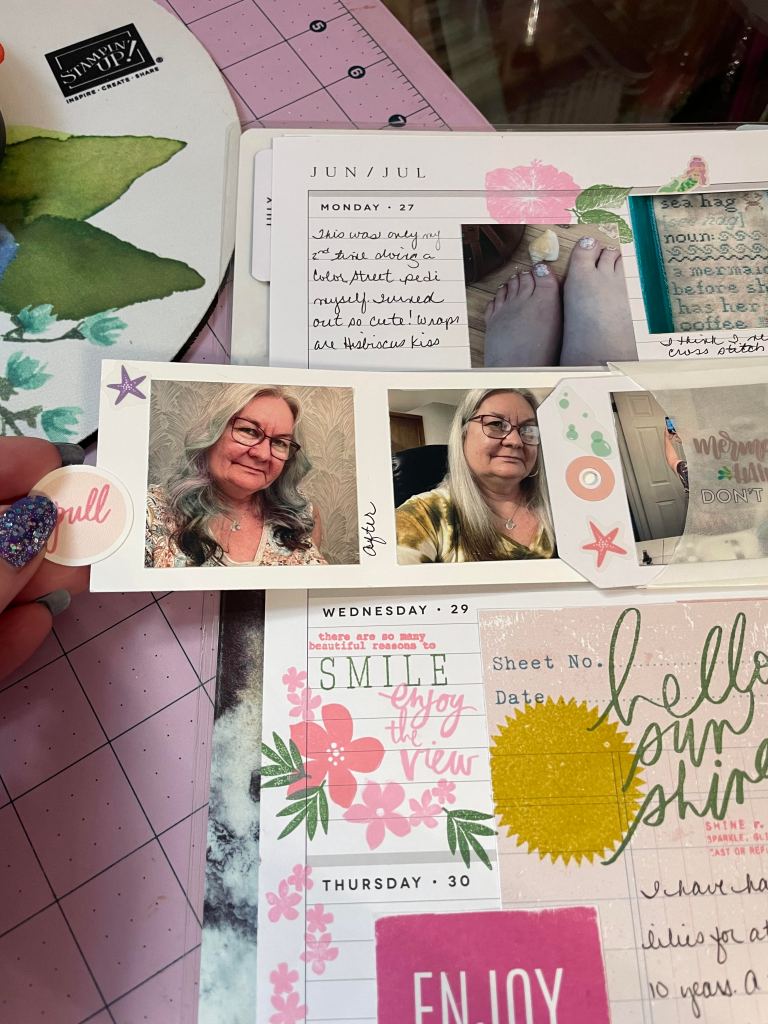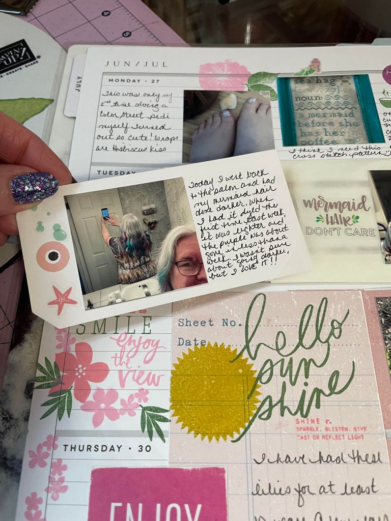 I had to incorporate a couple of Heidi Swap’s tag techniques which allowed me to add more photos about getting my mermaid hair done.