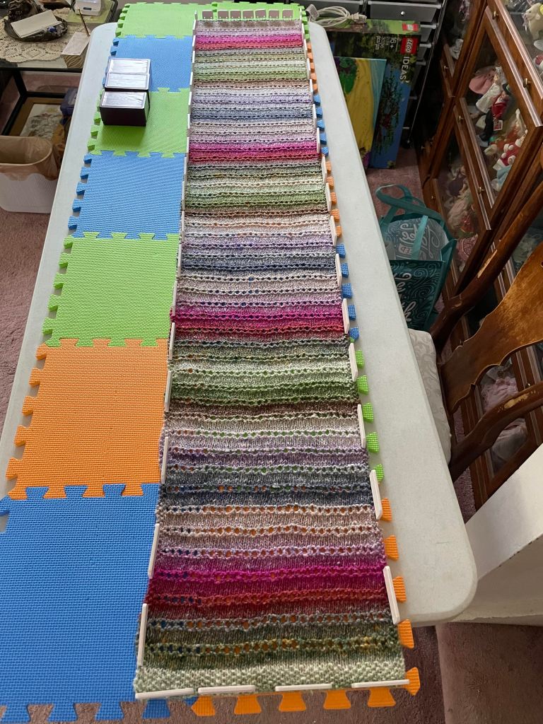The finished length was supposed to be 67″, but when I finished, it was only 42″ and I didn’t think I would get the correct length when blocking, without distorting the eyelets. I undid the bind off and ripped back to the eyelet pattern and continued with the pattern until I was close to finishing the skein, doing 52 repeats and then adding the seed stitch section and then binding off.