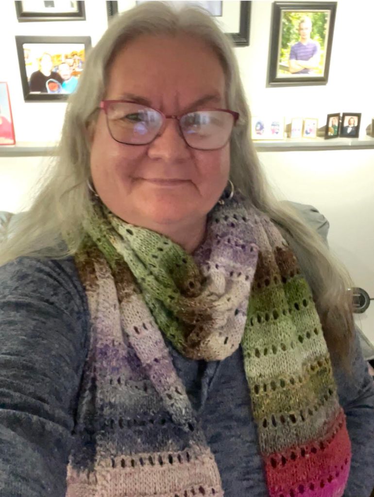 I was able to block it out to 73″ which is a much better length. This way I can fold the scarf in half and push the ends through the loop and have a good amount of the ends hang down. If I were to make this scarf again, I would definitely only cast on 37 stitches instead of 57. It is quite wide at 13″. I would prefer a narrow scarf. But it turned out nice and is nice and soft and hangs nicely.