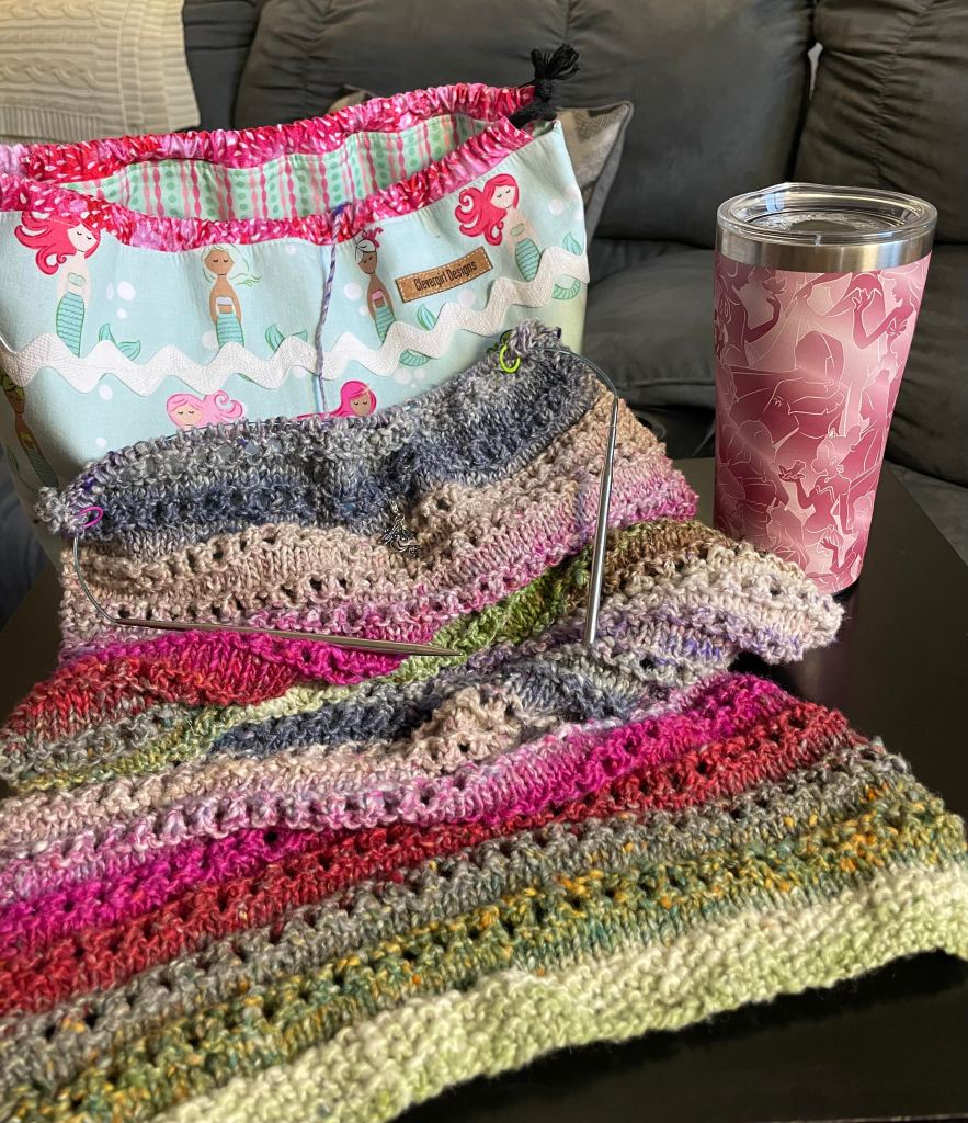 The color changes are quite beautiful and really flow nicely into the next. The yarn does soften up as I knit with it. This yarn is 50% silk, 25% wool and 25% nylon. So the silk really does make this knit up really nice.