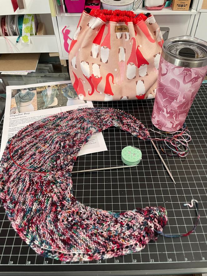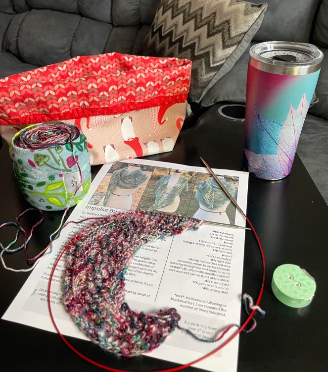 I started the Impulse Buy shawl. The yarn is La Jolla from Baah yarns in color Sleigh Ride. When my Mother in Law was here in October, we visited a yarn shop and both picked up a skein of this beautiful yarn. The colors are so gorgeous and will go with so many tops in my wardrobe.