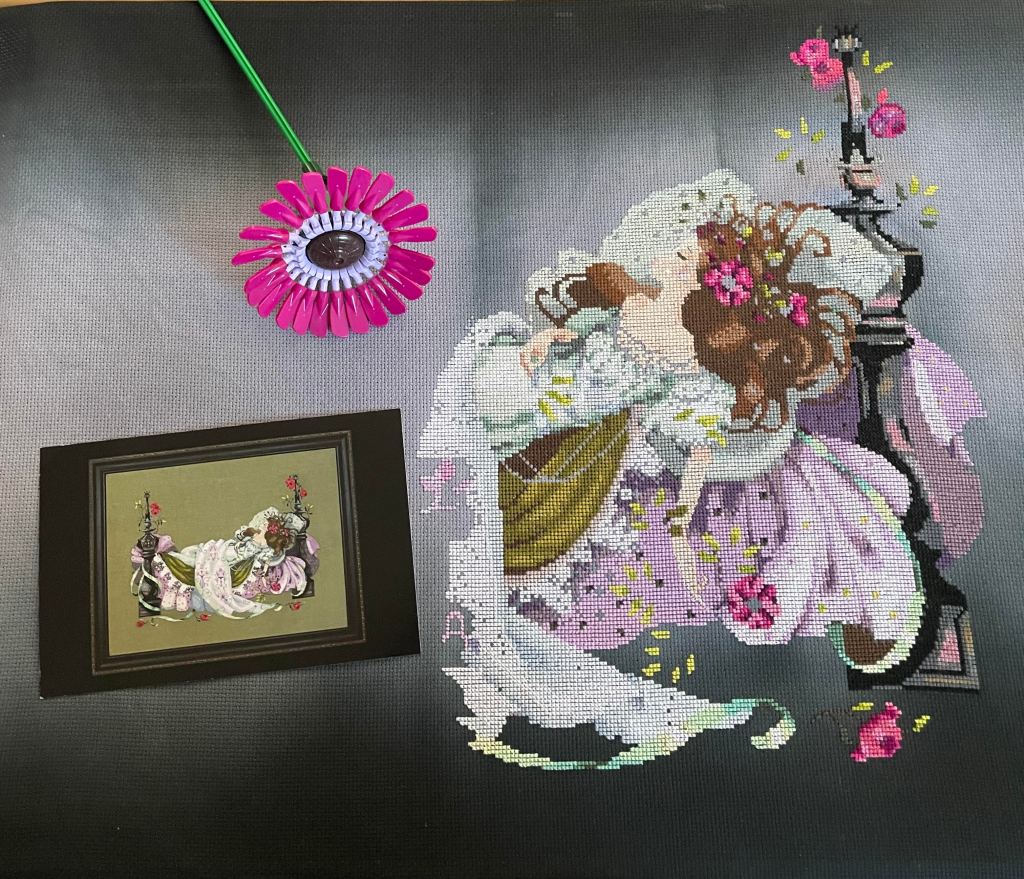 And here is where I stopped with her. I put her away to stitch on the Boardwalk. I’m not sure if she will get worked on again this year, but I am definitely planning on finishing her next year. The pattern is Rosamund from Mirabilia. I am stitching her on 16ct Aida Salem from Fiberlicious Yummy Fibers.