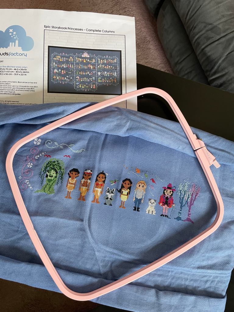 That piece was my birthday start in January and once I finished the Pocohontas section at the beginning of February, I put it away for now. It is so cute though and I will enjoy stitching on the next movie characters when I get back to it. The pattern is from Cloudsfactory and I am stitching on 16ct Aida Aeriel’s Grotts from Fabrics by Stephanie.