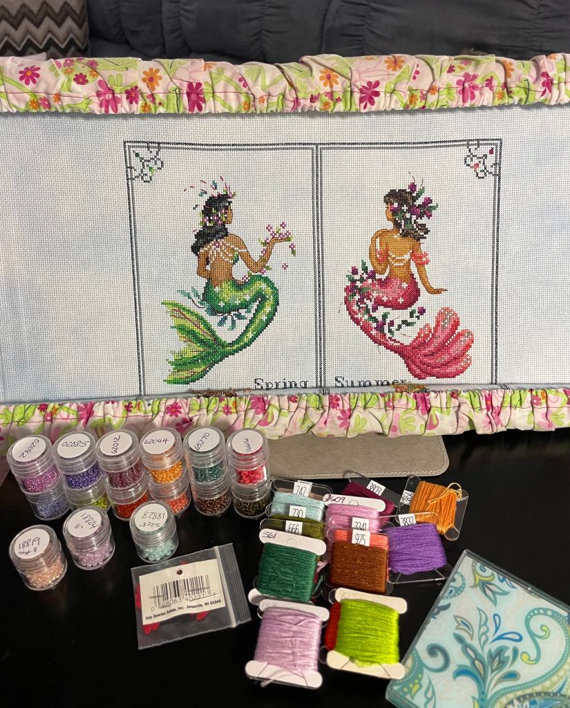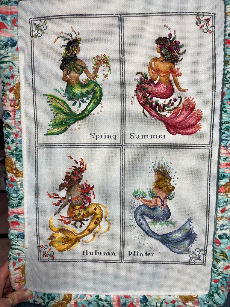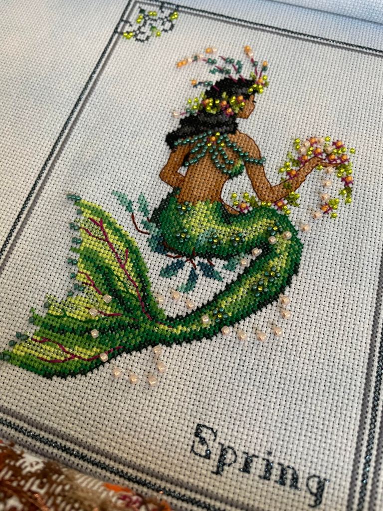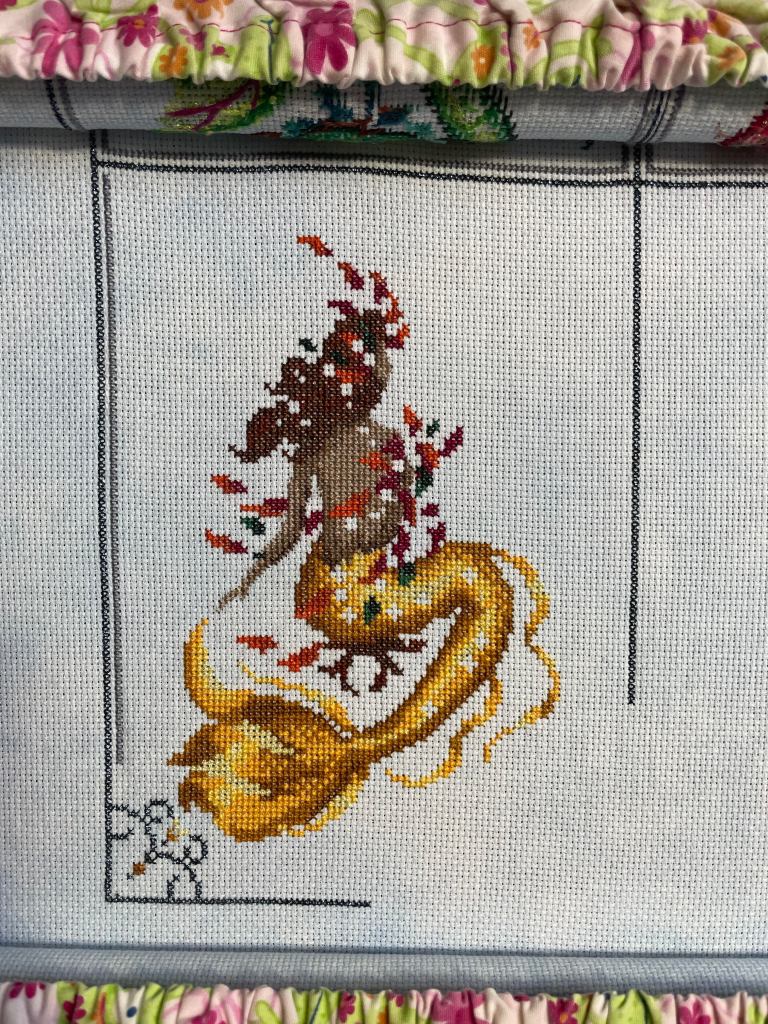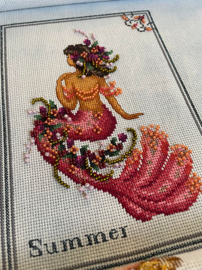 Next up I pulled out the Mermaids of the Seasons Piece from Bella Filipina Designs. I had finished stitching the Spring and Summer mermaids previously. So I stitched on the Autumn Mermaid.
