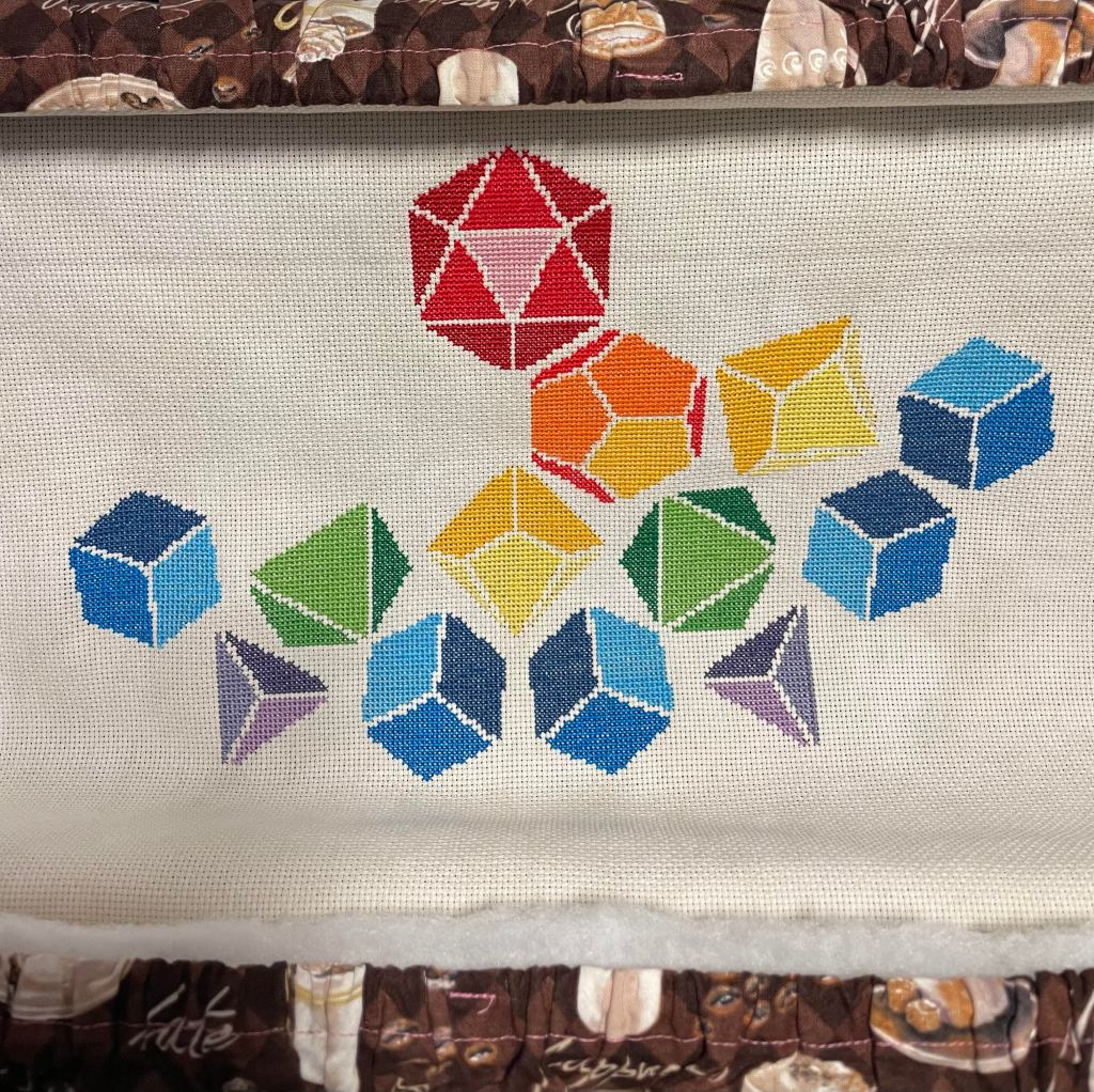 My current piece that I pulled out to add some stitches to is Rainbow Dice by Rack and Pinion on Etsy.
