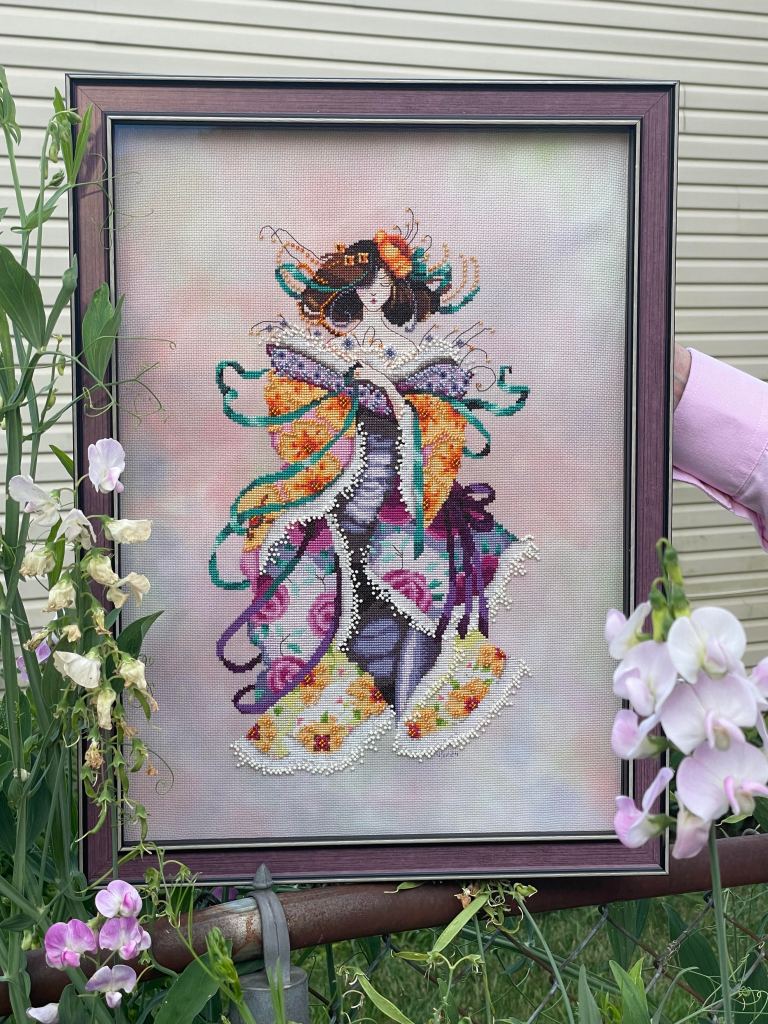 I finished Blossom by Mirabilia. She is so beautiful! I love everything about this piece. The fabric is 16ct Aida Busy Izzy from Fabrics By Stephanie. I used all of the called for floss and beads. Frame was picked out by my husband. I tend to gravitate to silver or gold or white frames and didn’t even see this frame until he picked it out. I decided to go with his choice and I am very happy I did. It’s perfect. Another WIP off of my list 🙂