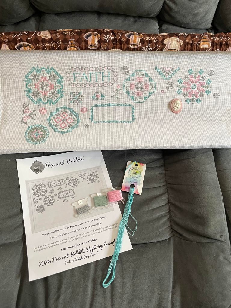 This is where I am with the 2024 Fox & Rabbit MSAL as of last night. I am working on the June section and should have it finished tonight and then I will have the July section to catch up on before the August section comes out August 1. The fabric is 18ct White that I picked up at Michaels.