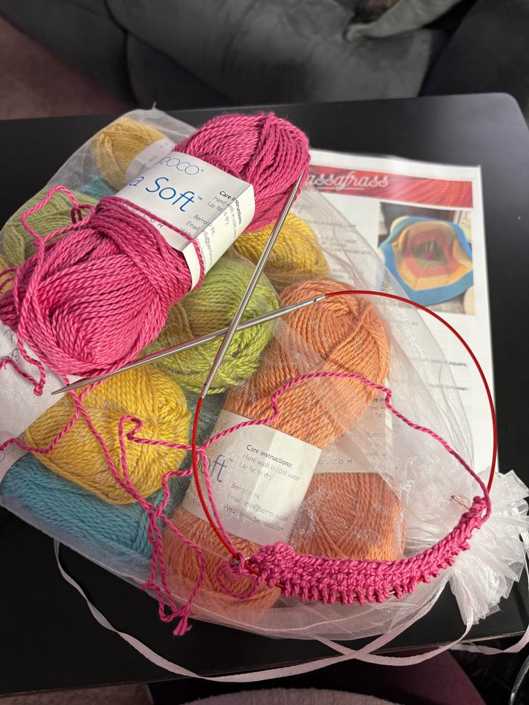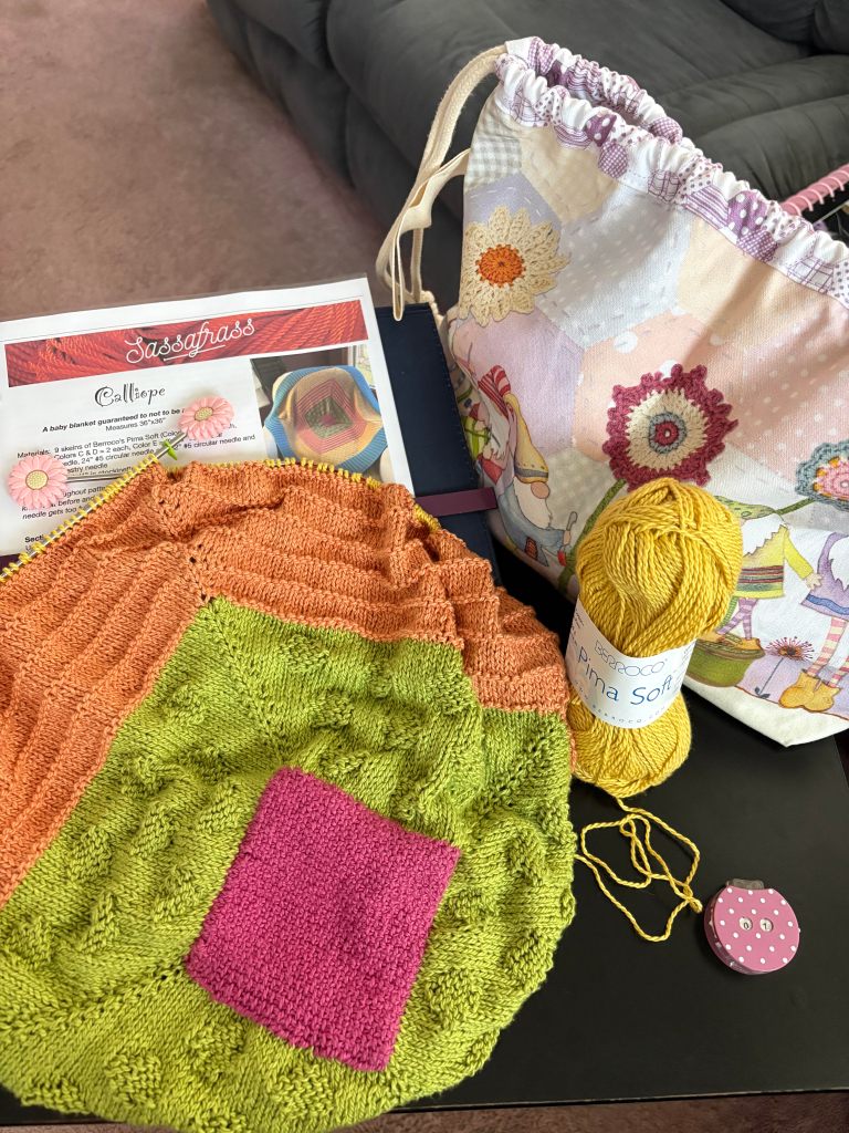 This is such a cute blanket and is knitted in the round. I have never knitted a baby blanket in the round. The pattern is from Sassafrass and I am using Pima Soft yarns from Berroco. I have to say that I LOVE stitching with this yarn! It is so soft and I think it is perfect for a summer blanket. This was a kit I purchased from my Local needlework shop some time ago.