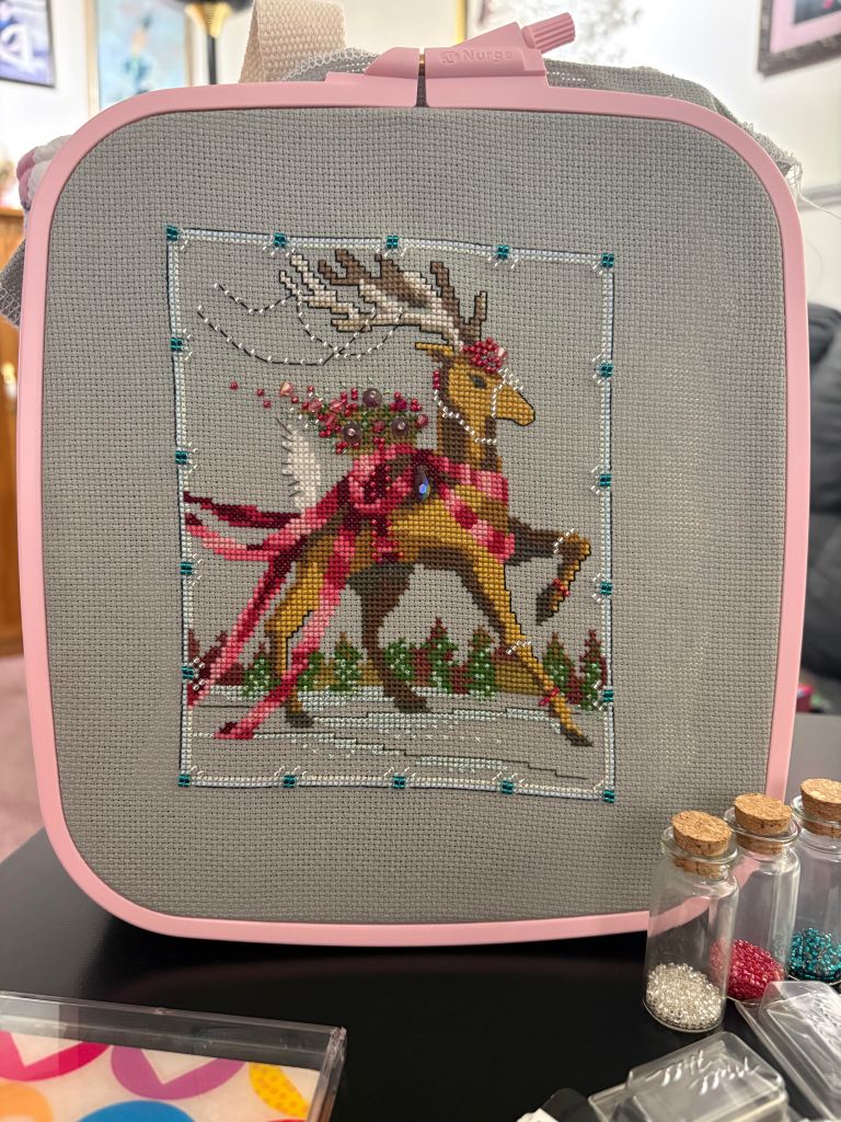 I finished Dancer in about 2 weeks. He was a fun stitch and is so sparkly with all of those beads and treasures! So now I have two deer finished…seven more to go š