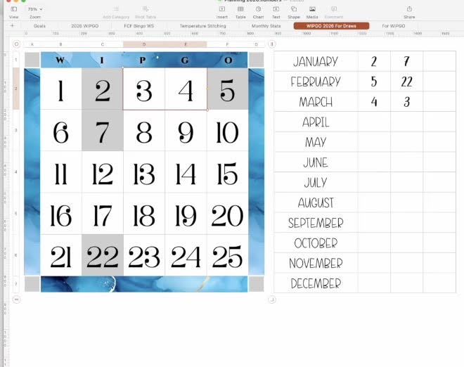 I can’t wait to stitch up the other letters and see how they look all together. Which brings us to the March WIPGO numbers: