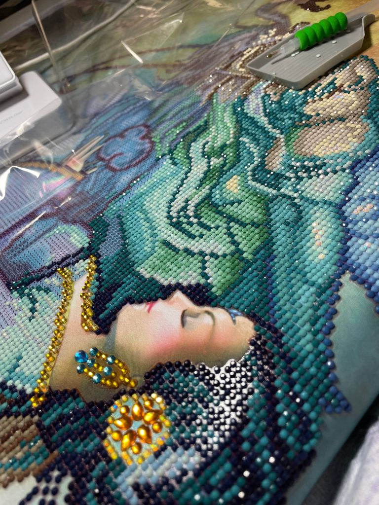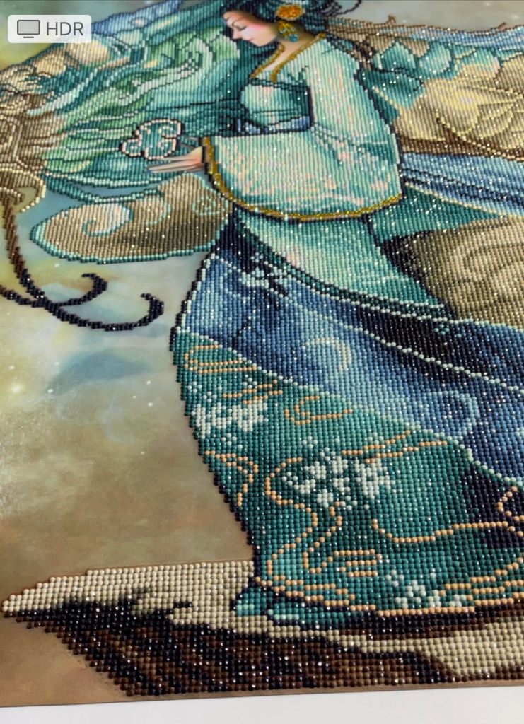 I don’t know why I waited so long to finish her. I will admit I kept thinking “I will finish her today”. After several hours each day for about 5 days, I finally did finish her. Now to save up to get her framed and hung in her selected space in the basement. I love Diamond Dotz or Diamond painting. It is so relaxing. I have a few more smaller ones in my stash. I wonder which one I will do next…Have you tried Diamond Painting or Diamond Dotz? What do you think about it?