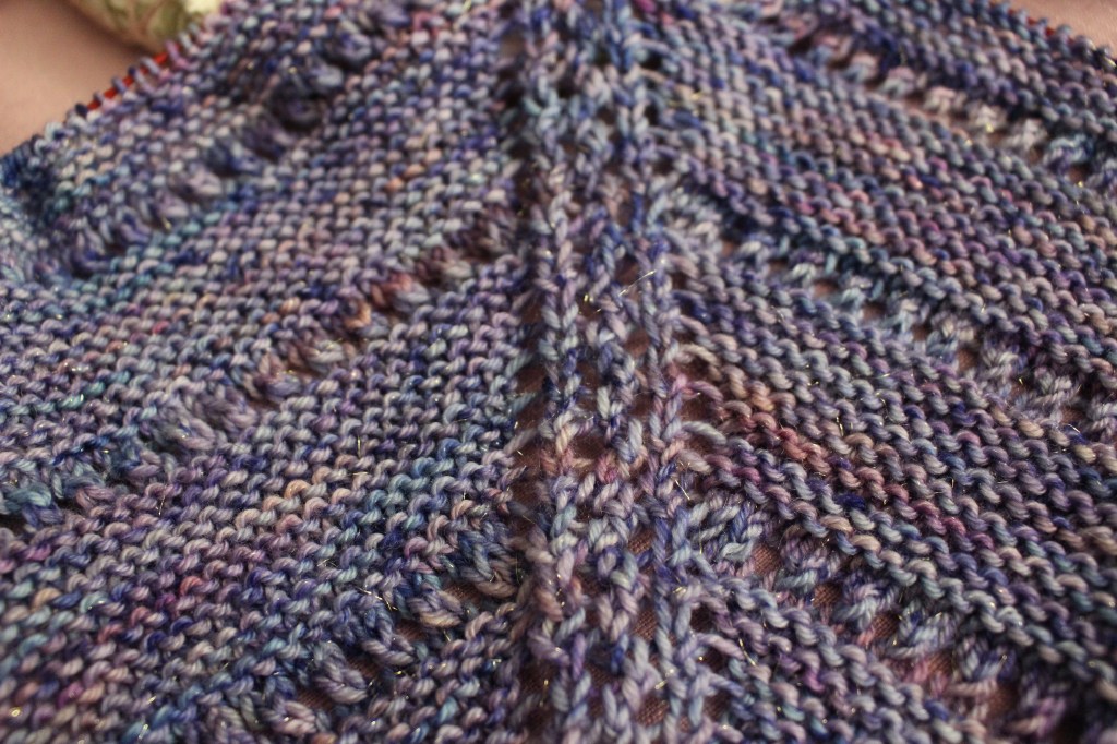 To start I had to make 5 mitered square blocks. 3 of these squares will form the back of the cardigan and the remaining 2 will be for pockets. This is my first time making mitered squares and I enjoyed making them. The pattern was well written and I didn’t have any problems. Well, a little with the center diagonal where the decreases are. I just had to remember to give a little extra tug. I love the way the squares look. The Topaz yarn makes them look a bit wonky. The yarn goes thick and thin throughout, so to me it makes them look lumpy. But like with the Marit shawl, they will look better with blocking.