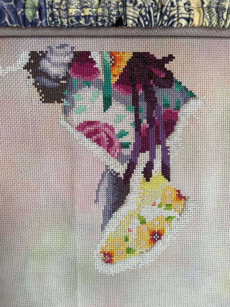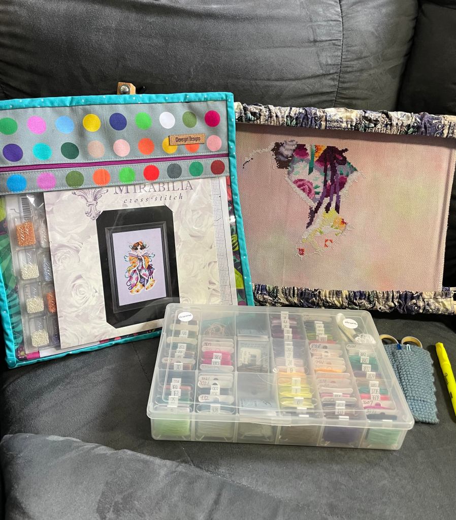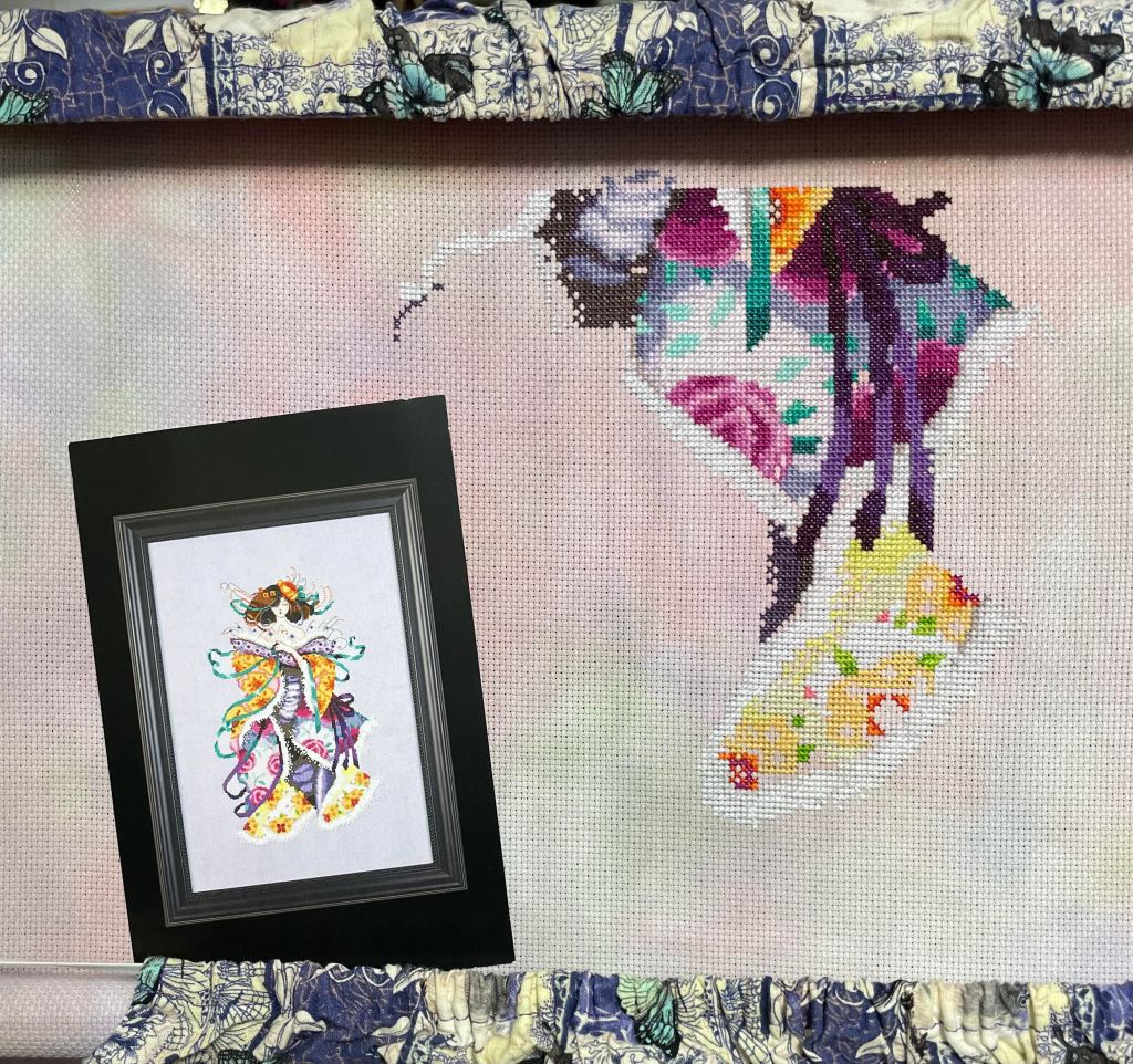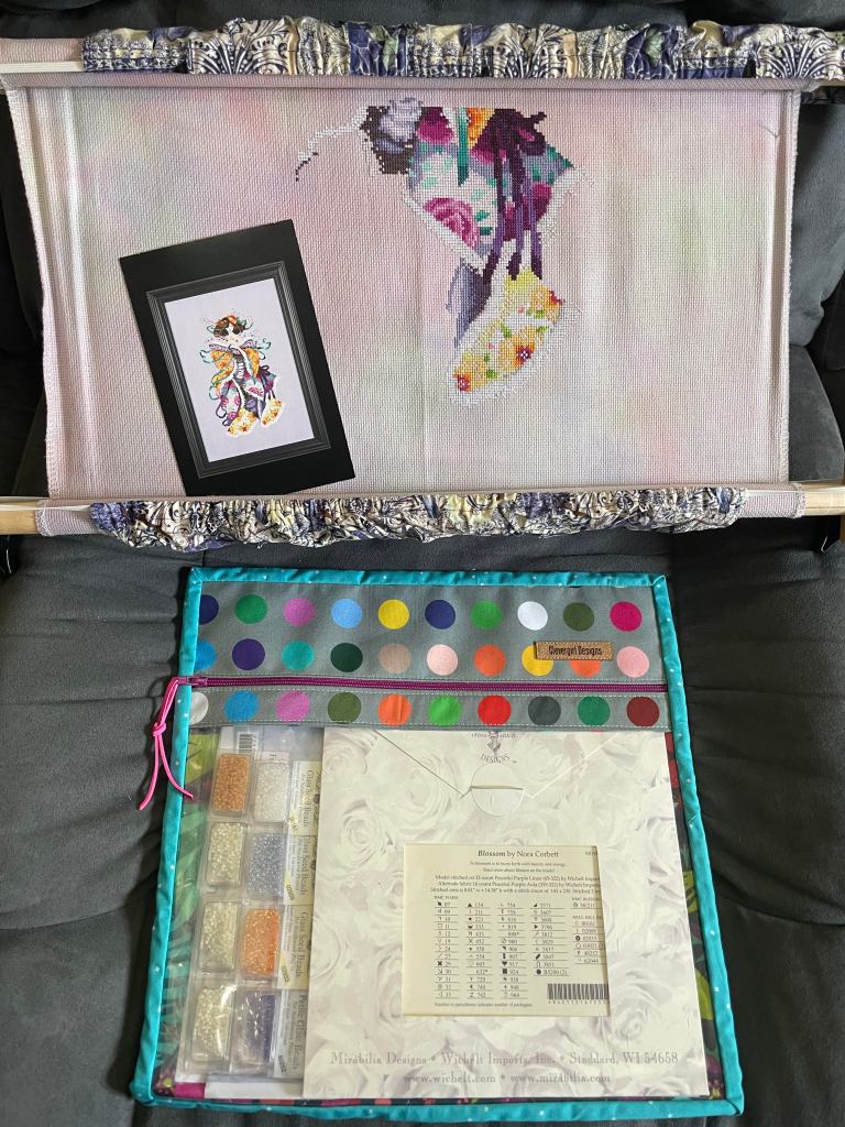 I finished Blossom by Mirabilia. She is so beautiful! I love everything about this piece. The fabric is 16ct Aida Busy Izzy from Fabrics By Stephanie. I used all of the called for floss and beads. Frame was picked out by my husband. I tend to gravitate to silver or gold or white frames and didn’t even see this frame until he picked it out. I decided to go with his choice and I am very happy I did. It’s perfect. Another WIP off of my list 🙂