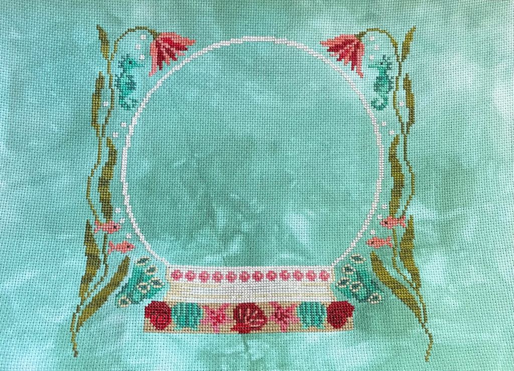 I loved stitching the frame. The Sea Gulls are so cute. The fabric is 16ct Beanstalk (the called for fabric) from Fabric On A Whim and is actually more blue than the photo is showing.