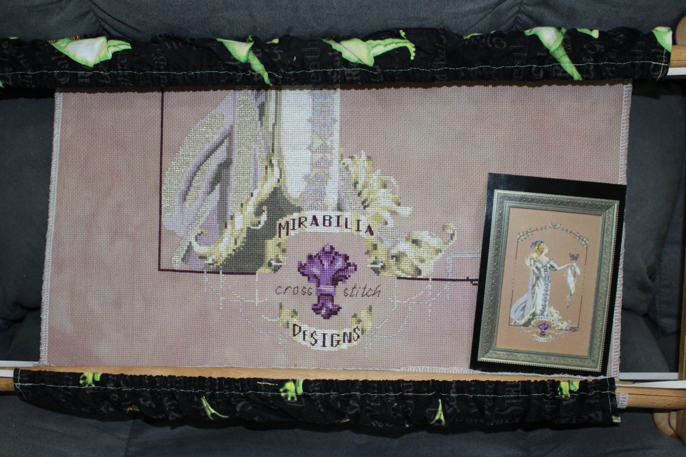 That brings me to my current project.  A cross stitch project that I started in 2018.  I am still working on conquering all of my WIP’s and have been so proud of myself that I have not started a new project yet.  This is Lady Mirabilia from Mirabilia.  I started her in July of 2018 and had put her away, probably to start a new project.  Here is what she looked like when I picked her up last week.
