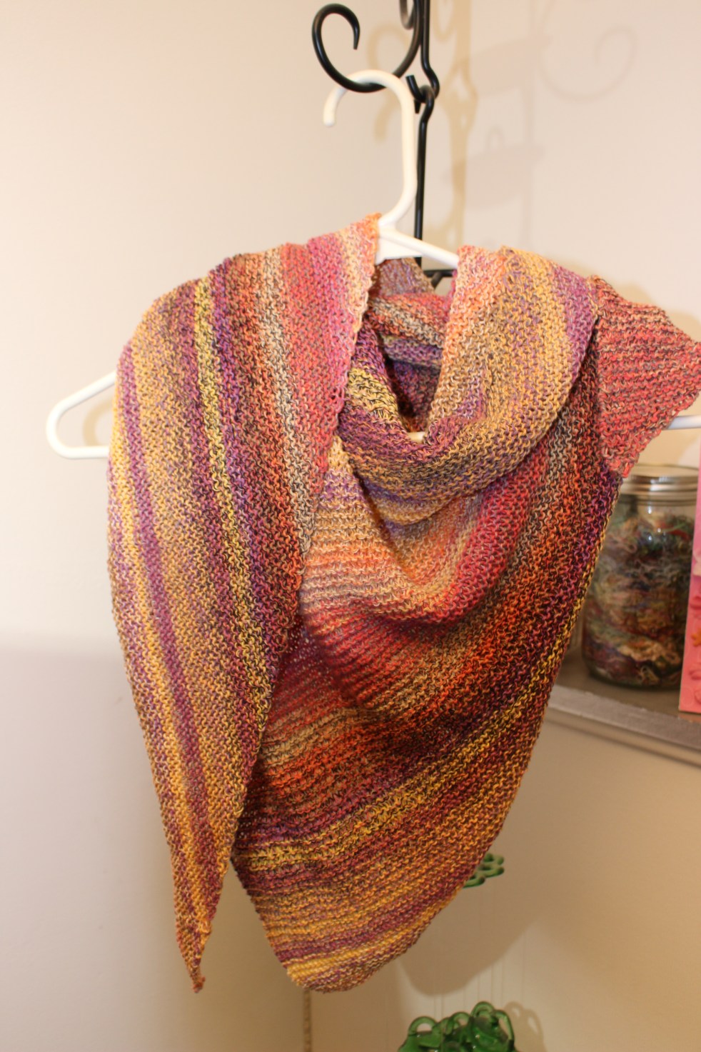 Not much to look at right now, but in a day or two, when it is all dry, it will be beautiful! I hope I have blocked it right. The Blue sparkly yarn is Tardis by Mint Rain Hand Dyed Yarns and the variegated yarn is Surf’s Up from AJHC Wools. Both were nice yarns to work with.