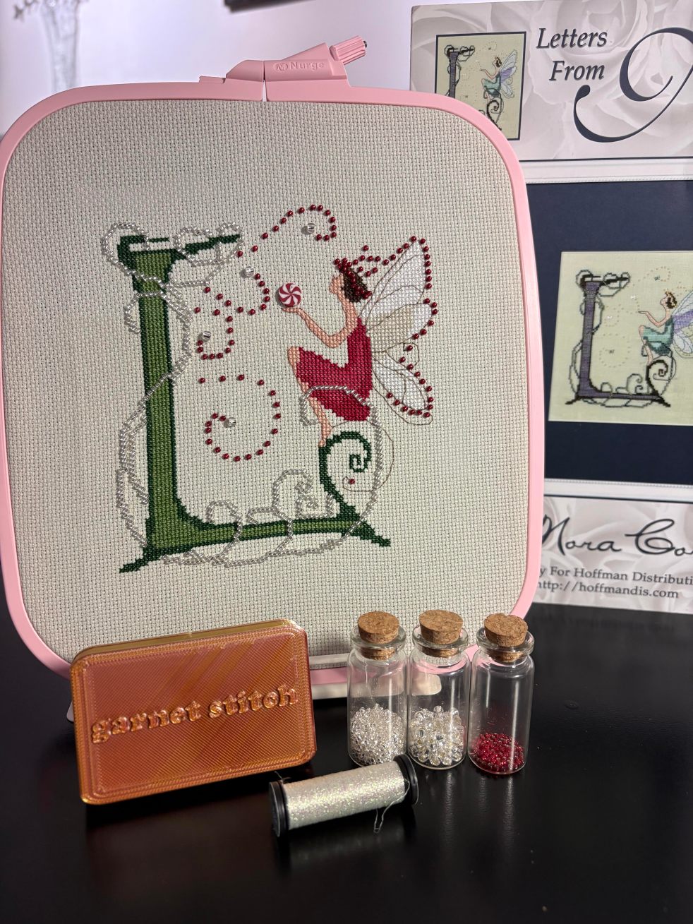 All of these letters are being stitched on 16ct Aida Artichoke and I have converted all of the thread and bead colors to Christmas colors. That was quite the process and I definitely applaud anyone who does conversions all of the time.