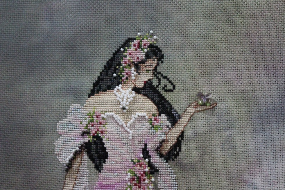 Look at that beautiful face! I have added some back stitching and more of the ribbons along the sides.