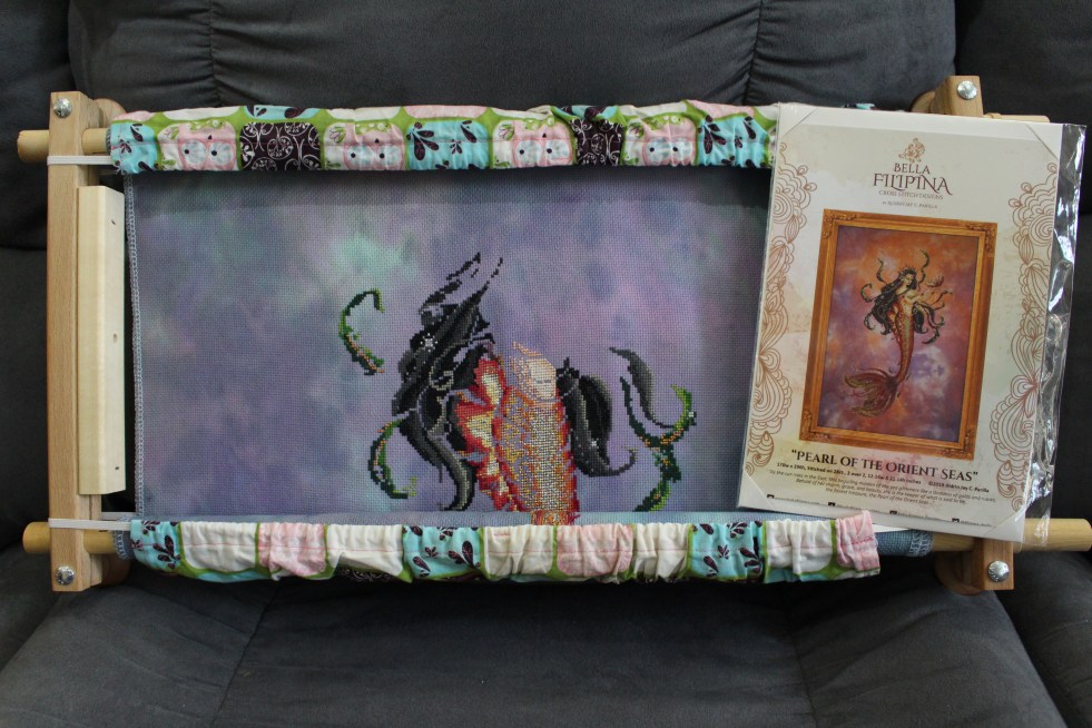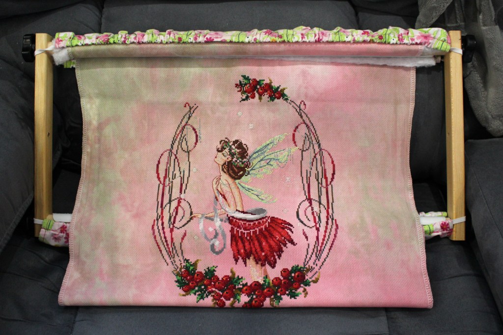 I spent quite a bit of time stitching on Holly Berry Pixie. The designer is Bella Filipina Designs and I am stitching her on a one of a kind 16ct Aida from Fantasy Dyed Fabrics (she is no longer dying fabric). When I last posted about her, I had her skirt done and the berries at the bottom.