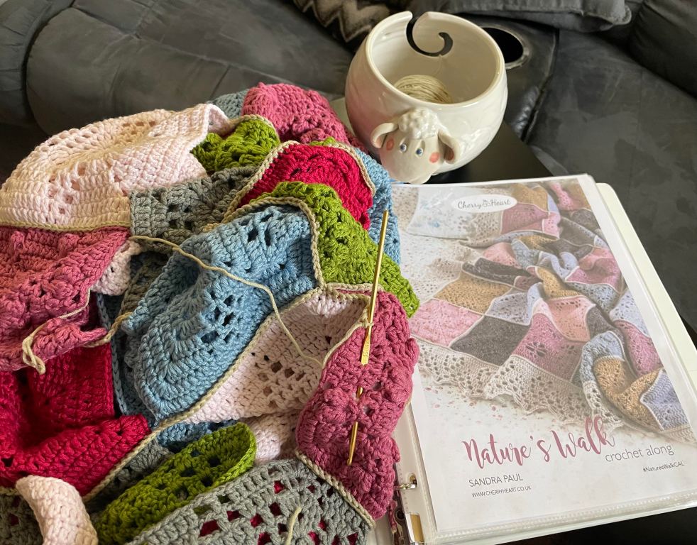 So where did I last leave off…Oh yeah. I was trying to finish up unfinished projects. After I finished my Windsor Mitts I pulled out my Nature’s Walk Blanket crochet blocks.