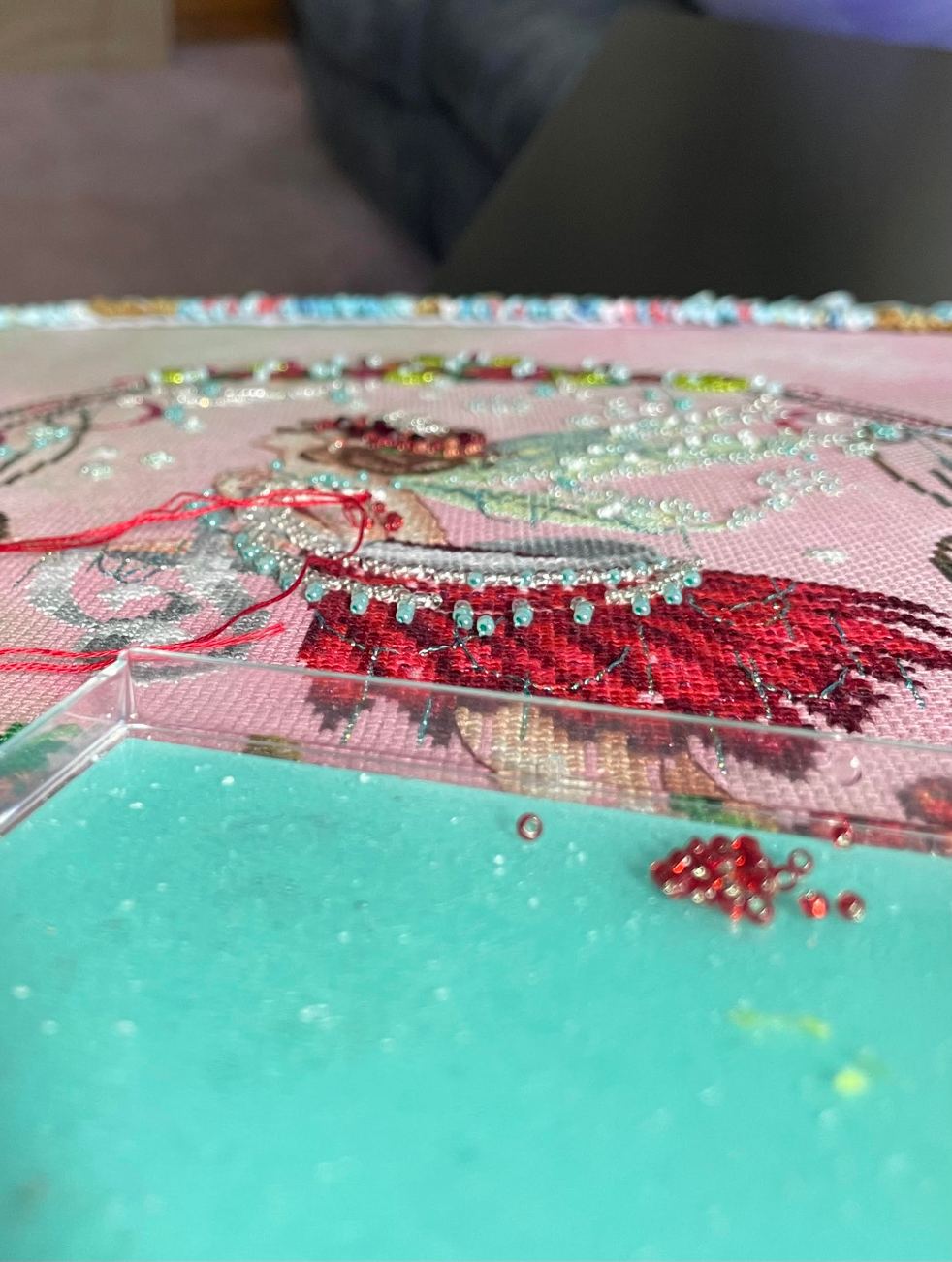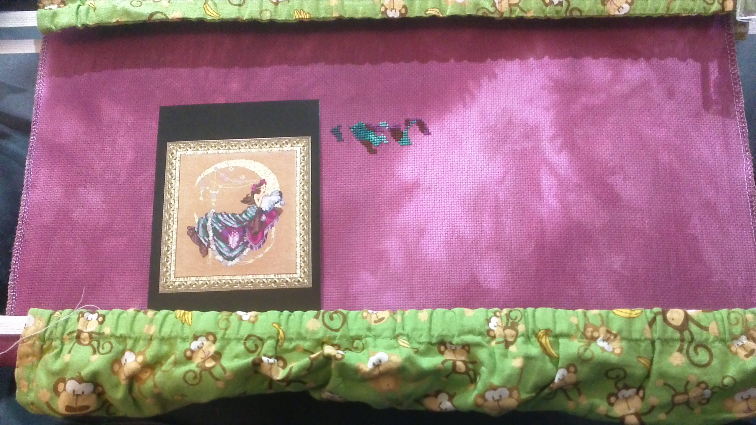 Figuring out how to wrangle this very large piece of fabric has been a bit of an issue, but so far I have managed. My fabric is 16ct Aida Ariel’s Grotto from Fabrics By Steph. The size of my fabric is 50 x 36! Wow. Definitely the largest piece I have ever worked on. Here is my progress after a week of stitching on it.
