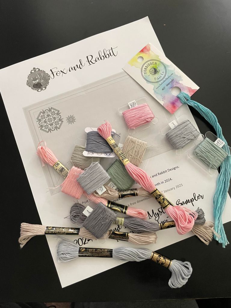 The name of this SAL is Faith Hope Love and my main color thread is the blue thread from Forbidden Fiber Co. called Mermaid (of course 😉 ) I also knew I wanted pink and gray, but what shades? After a few days of playing with threads and colors, I finally landed on my pallette.