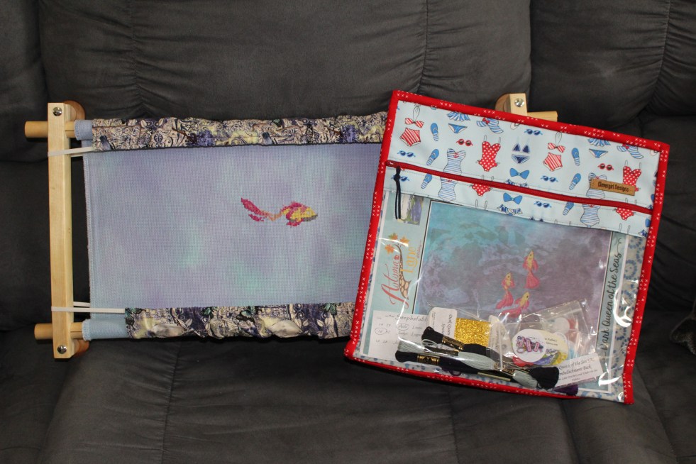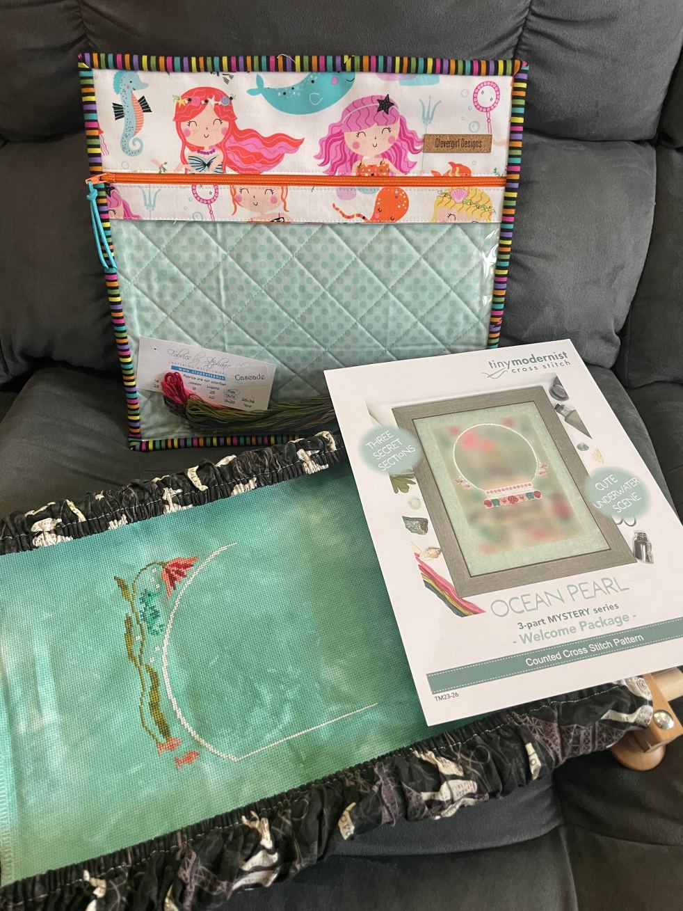Just look at that cute little seahorse and those little fish! This is a cutesy pattern, but I am really liking it. And I do like stitching with Classic Color Works threads and Weeks Dye Works threads. There is something about stitching one X at a time that feels different, but fun. And of course, a cute mermaid bag for a cute mermaid project. I’m not sure if I showed that bag before or not. These are my favorite project bags from @clevergirldesignsco. She does a beautiful job on her construction and choosing fabrics. At the end of 2022 my husband bought me another year of bags. One a month for a year, but I let Kristine know that she can do them anytime and the last couple of years she has been doing 2 or 3 at a time.