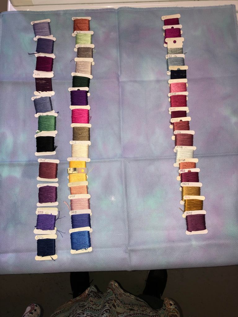 The Ocean Pearl Series by Tiny Modernist. The word Ocean grabbed me as well as the cute little mermaid. I showed you that I found fabric in my stash (Bonus!!) and ordered the threads. The fabric is 16ct Aida in color Cascade by Fabrics By Stephanie. I am using the dyed flosses from Classic Colorworks and Weeks Dye Works as well as 3 DMC colors as recommended.