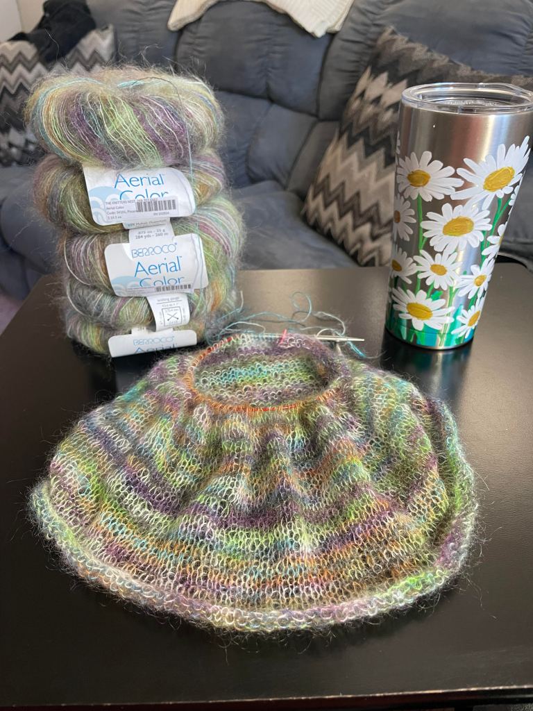 The pattern is The Alexander Airplane scarf by Churchmouse Yarns and Teas. The yarn that I am using is Aerial Color from Berroco. This is a very fine mohair yarn knitted on size 8 circular needle. It is knit in the round and when finished the tube is laid flat and the edges are pressed or steamed so that the scarf ends up being 2 layers. Because the yarn is so thin, it isn’t bulky but will be warm and cuddly.